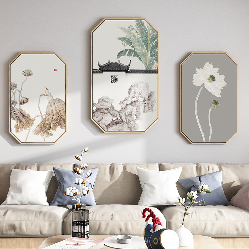 如果你还认为新中式的装修风格,只适合老年人,就错了,现在很多年轻人也深深的爱上了新中式的优美,漂亮的荷花挂画,两旁挂上壁灯,深色框架的沙发搭配米色的坐垫,让客厅变的很有韵味。
