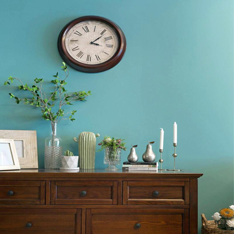 以浅蓝色作为空间基调,结合胡桃色的实木斗柜,搭配出了清新而又简约年轻的氛围;在复古的挂钟与绿植的点缀下,还充满了自然舒适的味道。