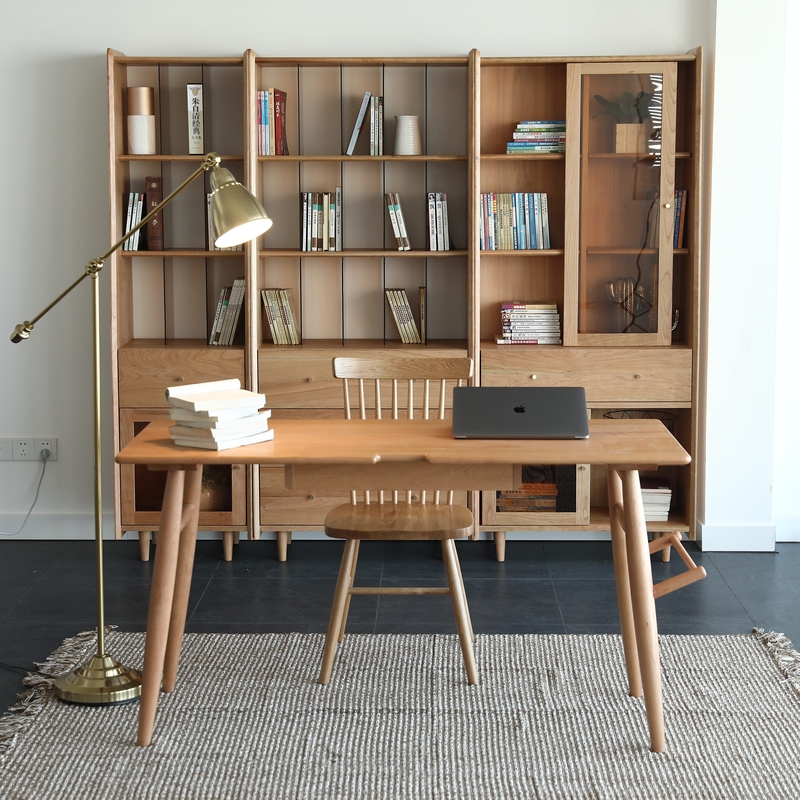 书房是单独一个居室空间或是容合在卧室OR客厅,书房三宝;书桌、书柜、靠背椅,这样选择让你的学习环境更具文艺内含。樱桃木原木家具浓郁的原始本真的自然气息,纹理似画胜似画,配以黄铜色配饰台灯更显品质奢华。