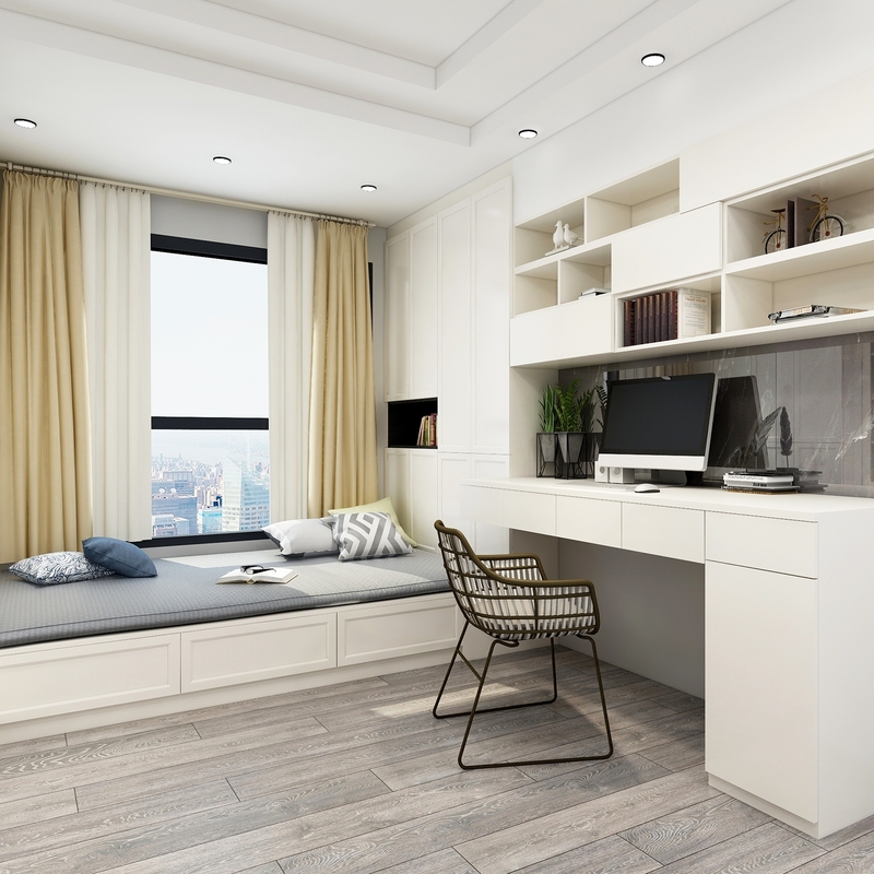 极简风榻榻米定制,简约不简单,每一处都有可见的精彩,隐藏式储物空间,一体式书桌,紧凑设计,展示柜组合,藏露有度。