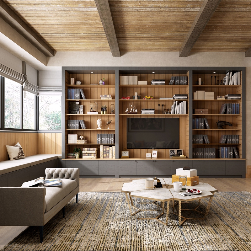 开放式电视柜展示功能强大,北欧原木色调加入灰色调,慵懒惬意之间又极具品位。灰色仿木纹地面铺上纹理自然的地毯,丰富空间层次感。窗边收纳柜充当卡座,百叶窗提升窗边的浪漫格调。