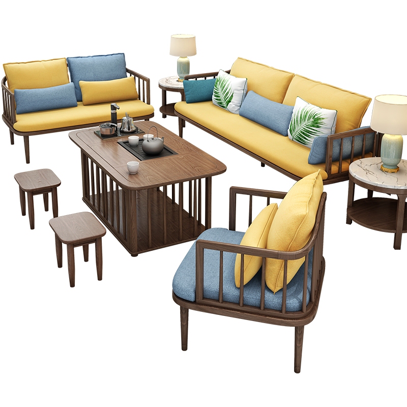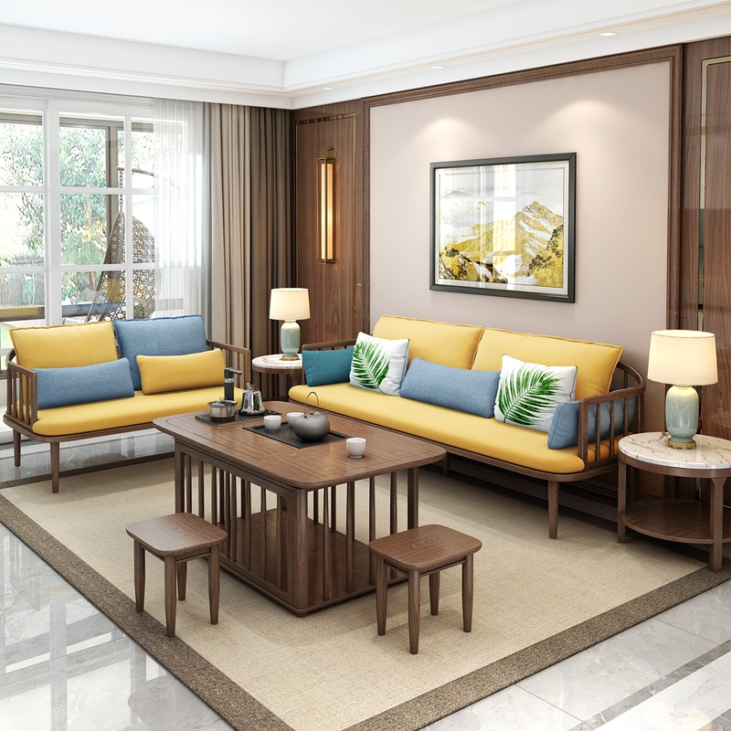 冬夏两用撞色实木沙发,传统又不平庸。 厚重白蜡木茶桌,有一种特有的东方雅致与气质。 泡一壶茶,与三五同伴坐下言欢,慢慢品味,共叙家常,生活自然有意。