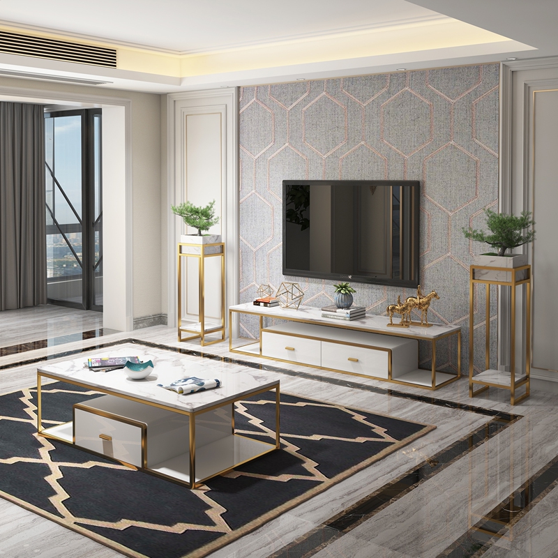 轻奢质感的茶几电视柜组合,装点客厅的风格。大理石花架既可作客厅的装饰,又可种植绿植和鲜花,增添客厅的活力感。