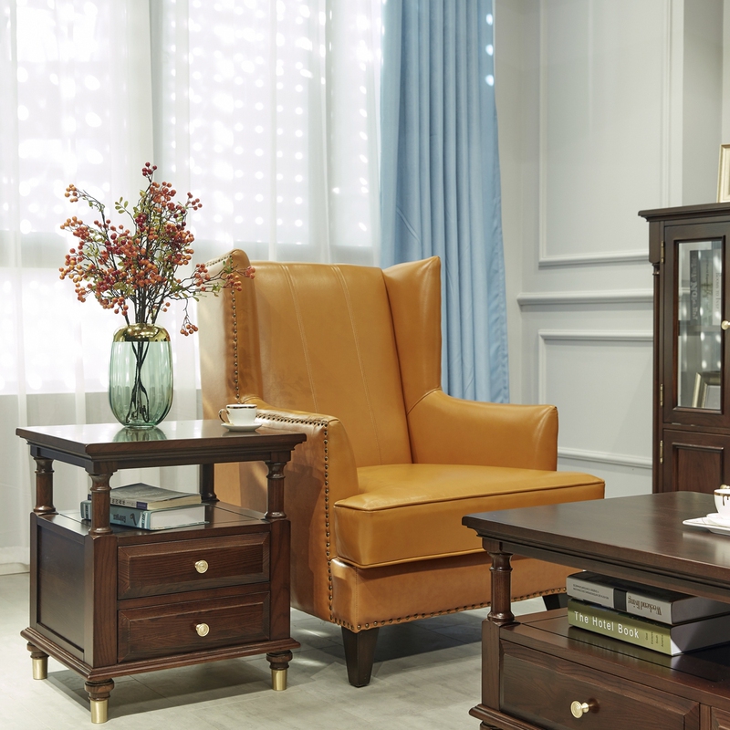 客厅一角,保留了简约美式的俊雅,进而追求优雅、轻奢的居室氛围。实木的材质加上少许黄铜点缀,让居室多了一些现代气质,暖色系的插花摆件,营造了浪漫雅致的气氛。