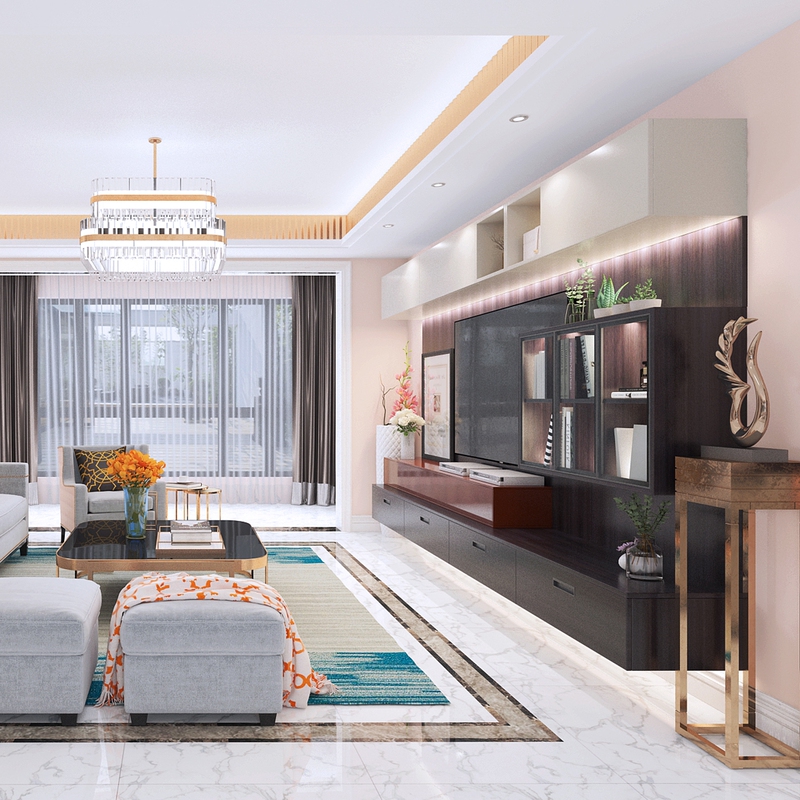 简约中透着奢华的气息,在冷色与暖色之间得到了一个平衡,空间更显和谐统一。深灰窗帘与浅灰沙发,也是十分大气了。