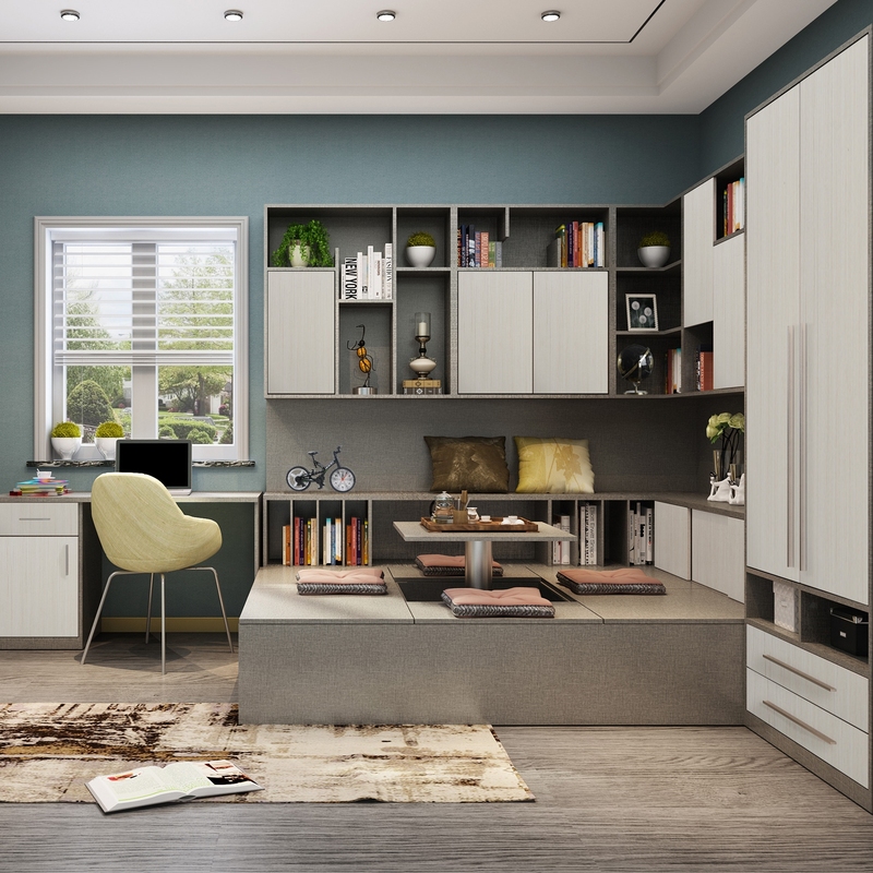 在榻榻米设计成可升级的小桌,平日里可邀上好友,品茶、对弈、聊天,承担着休闲茶室的功能;或是在工作区域感到疲惫,那么移步榻榻米,无论是闭目养神还是品茶,无疑都是缓解压力的方法。
