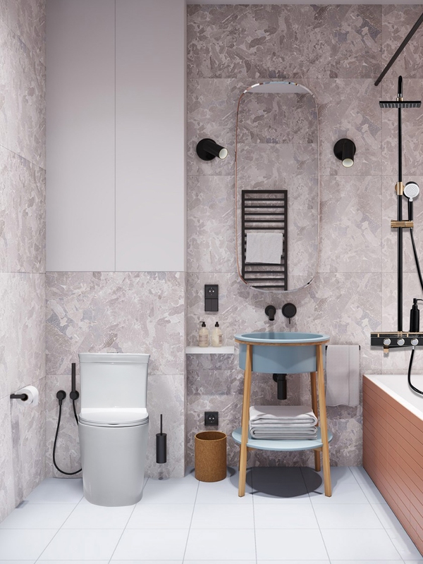 卫浴间铺有浅色花岗岩板,简约、温馨。天蓝色的洗漱盆和粉色的墙砖,使空间设计更加明亮,彰显出空间的精致感。黑色壁挂花洒与白色卫浴则有种新时代的酷感。