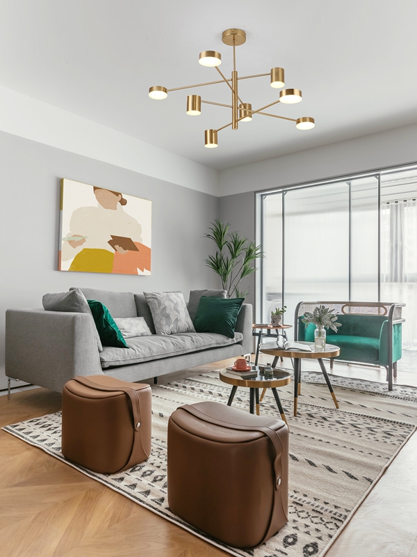 客厅布局开阔明亮,所有的线条简约而规整,克制且必须。灰白的低调让渡出更多的视觉焦点以承载孔雀蓝的高贵,诉说着一种精致清雅的存在。没有繁多的装饰,更显空间的通畅大气。当代艺术被融入到挂画、摆饰、家具的每...展开