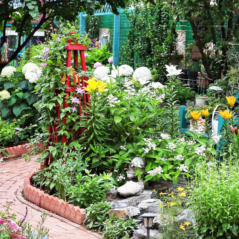 这个花园一角整体以白色绣球为主,和大红色的装饰物形成一个强烈的对比,上面还攀爬着一些紫色的铁线莲,在往右边就是各色的百合,看着十分清爽自然,好像夏日的炎热都被驱散了不少。