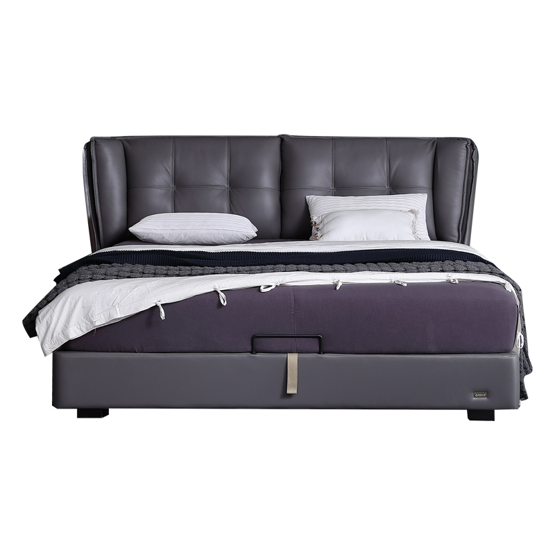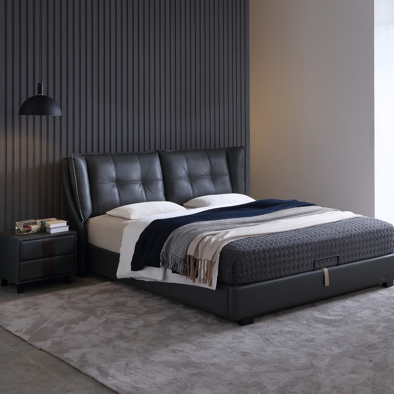 奢华真皮床,只为高贵有品位对生活质量有高要求的你准备。床垫采用独立弹簧和天然乳胶,舒适睡眠一整晚,搭配同色系床头柜,整体卧室看起来非常沉稳大气。商务型男人必备卧室家具搭配。