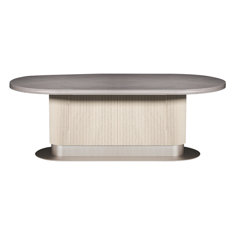 在餐厅运用大面积的落地窗,将蓝天白云变成就餐时的背景。餐桌椅上规律排开的线条,和拼接的木质桌面,以及细绒温暖的椅面,设计师在构想时输入高级的雅致感,没有攻击性,只留下一片通透的艺术饕餮。