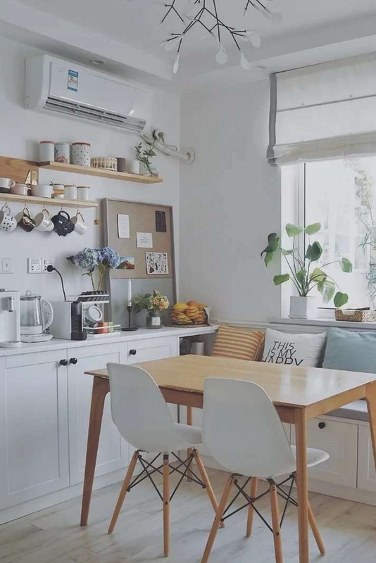 家中是小户型空间,如果按照传统的方式去打造餐厅个人感觉真的很拥挤,所以我利用了窗户一角的位置,在这里设置一个转角卡座,并且安装橱柜,这样一个简单的餐厅空间就出来啦。