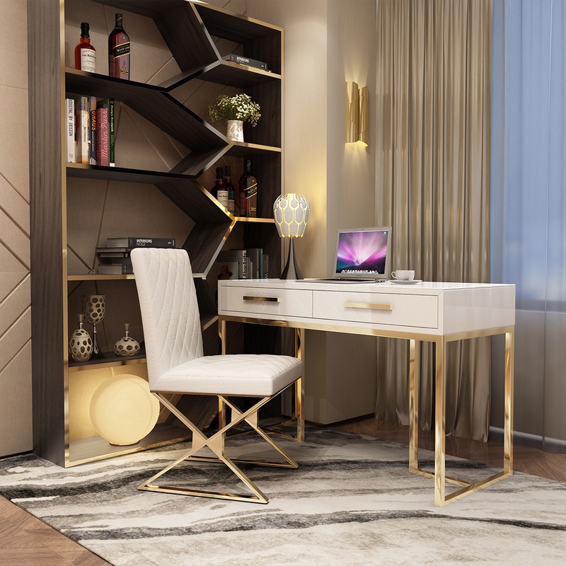 书房家用,轻奢写字台。国标3C钢化玻璃台面,E1级环保板材,实木抽屉,不锈钢镀钛金桌腿,承重更强,简单舒适,轻奢大方。酒店设计师力荐,档次瞬间提升,值得拥有。