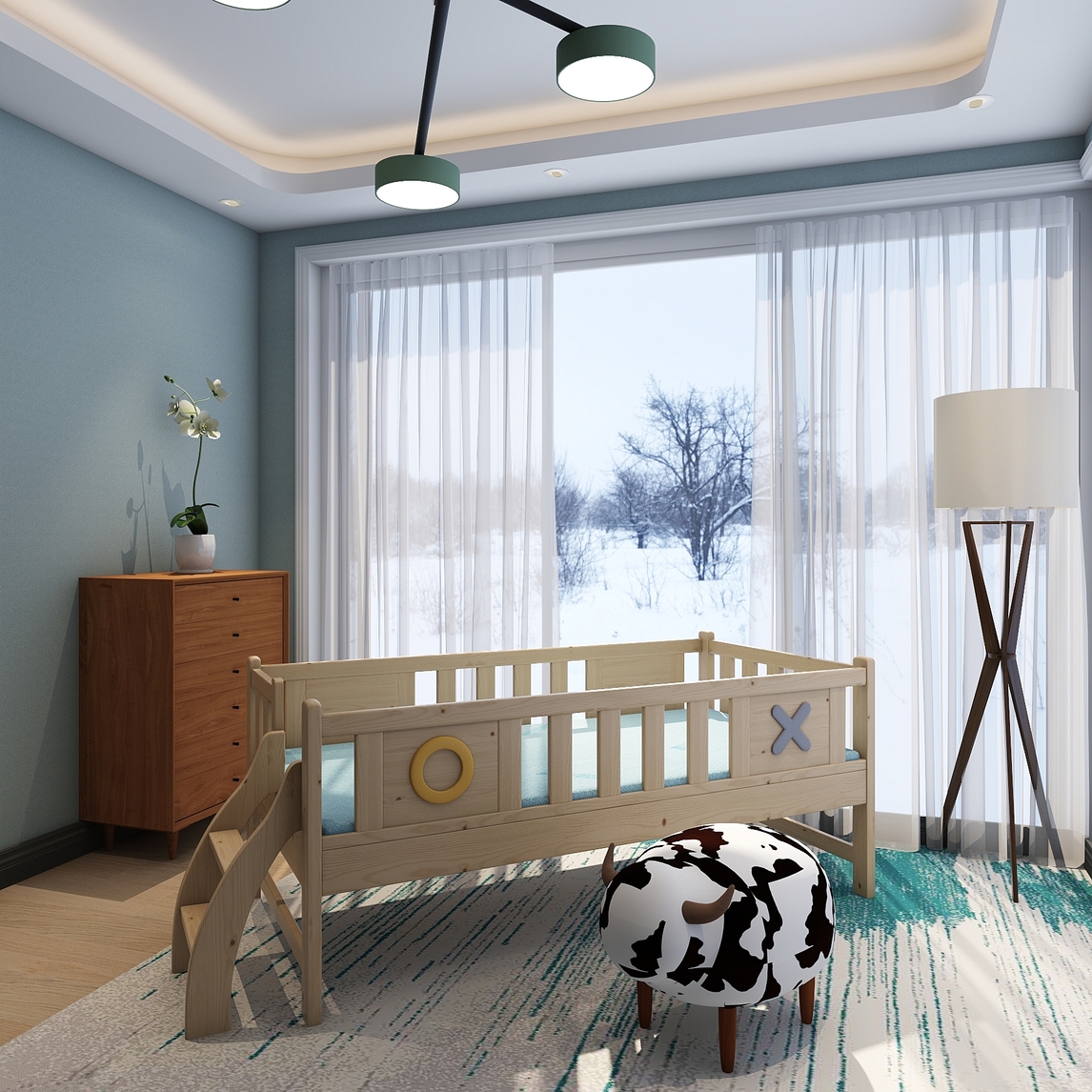 一整面的落地窗设计让房间明亮了起来,同时家长在照料小孩子时也可以欣赏外面的美景,不会只被家里的琐事所包围,心情也会更为舒畅。 大面积的地毯可以保护小孩子柔软的皮肤,高矮适宜的床架能让小孩不会在睡梦中掉...展开