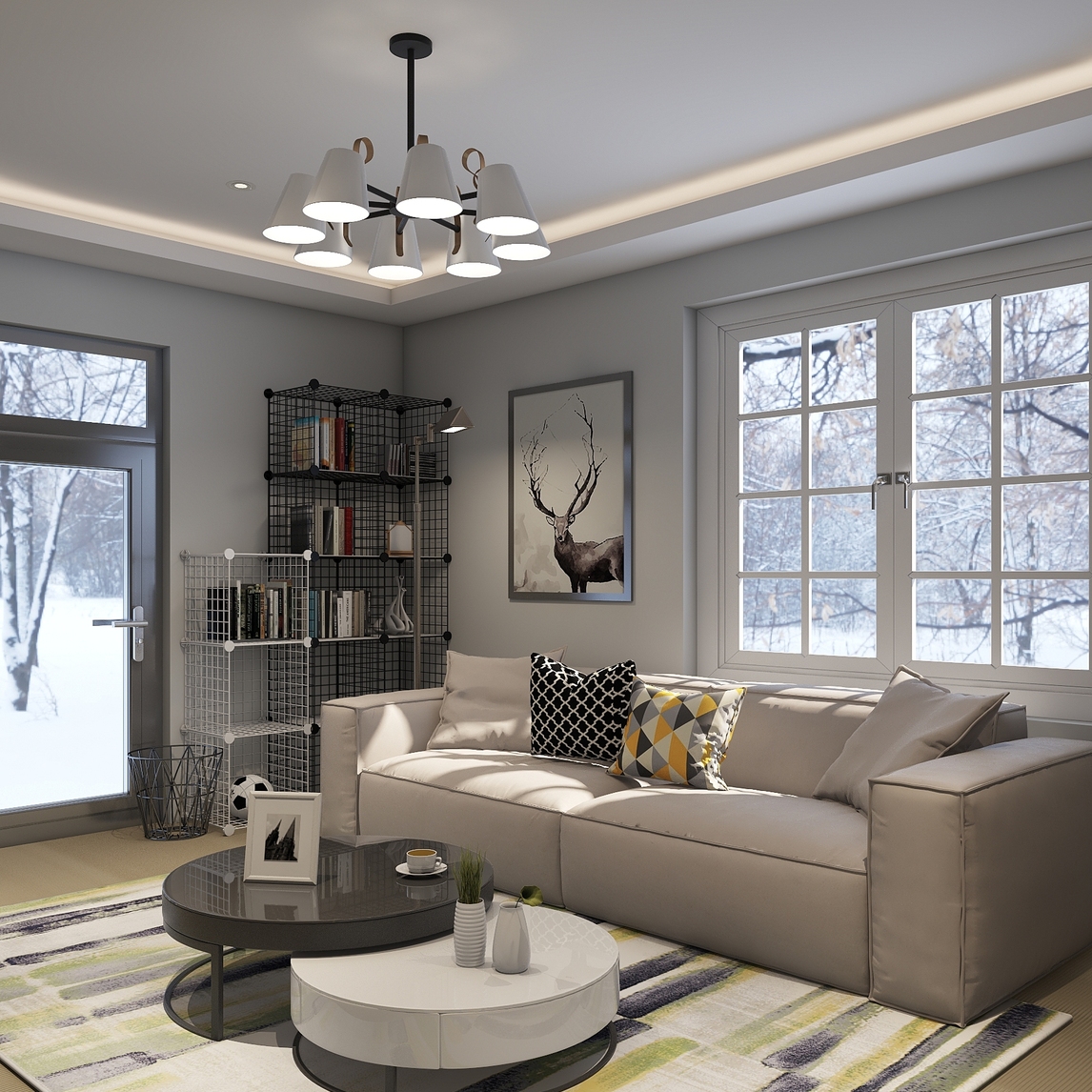 以灰色为主色调的客厅,简约明亮极富设计感。浅灰色布艺沙发搭配现代风抽象地毯,营造出柔软舒适的慵懒感。同时客厅中央黑白大理石茶几和沙发边的黑白铁艺置物架,以色彩和材质的搭配,烘托出客厅的精致格调,让懒宅...展开