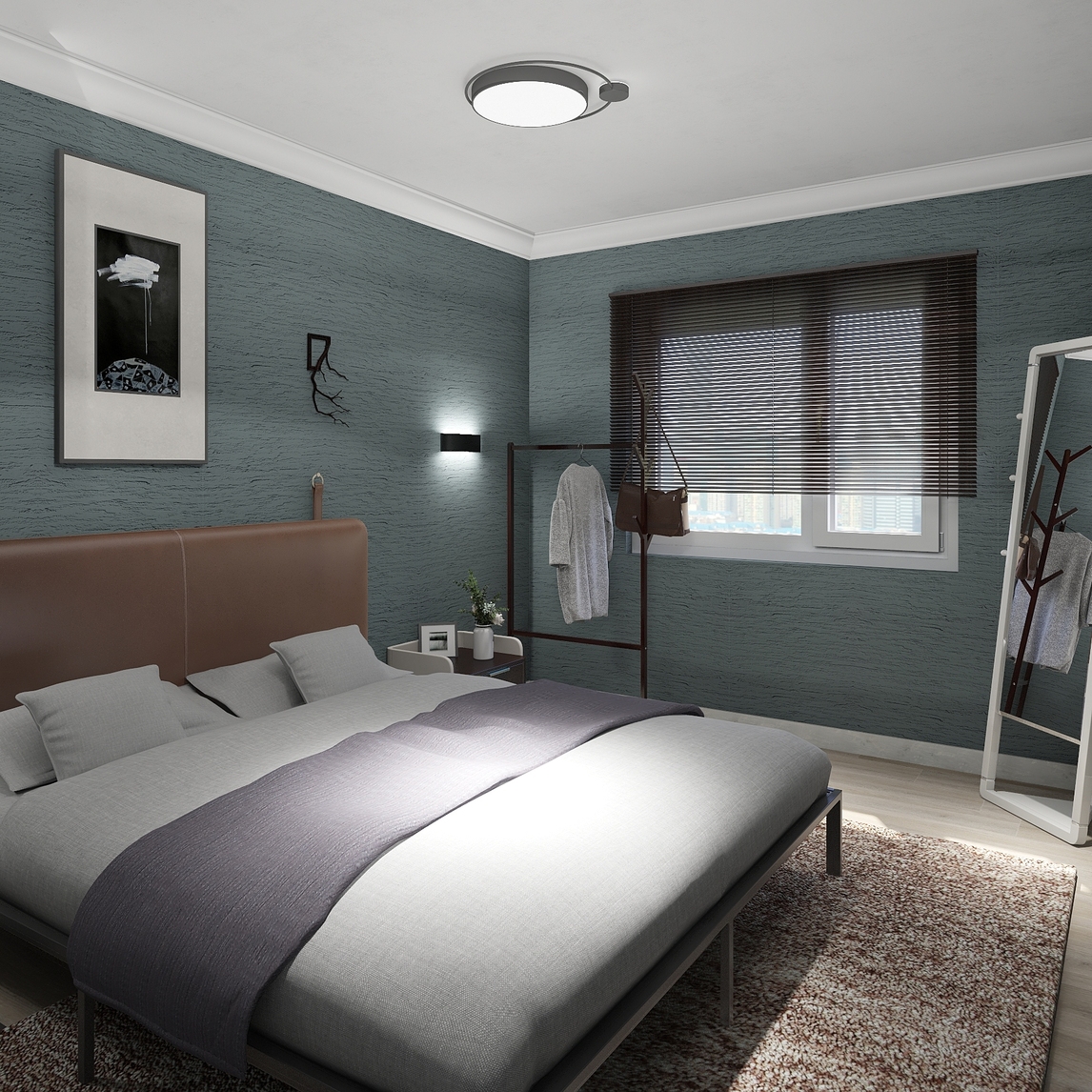 灰绿色的壁纸让整个空间安静下来,舒适的大床配上温馨的床头灯,墙上的画给空间增加一丝活泼,舒适的地毯,这大概就是我所想的最温馨的睡眠空间了吧