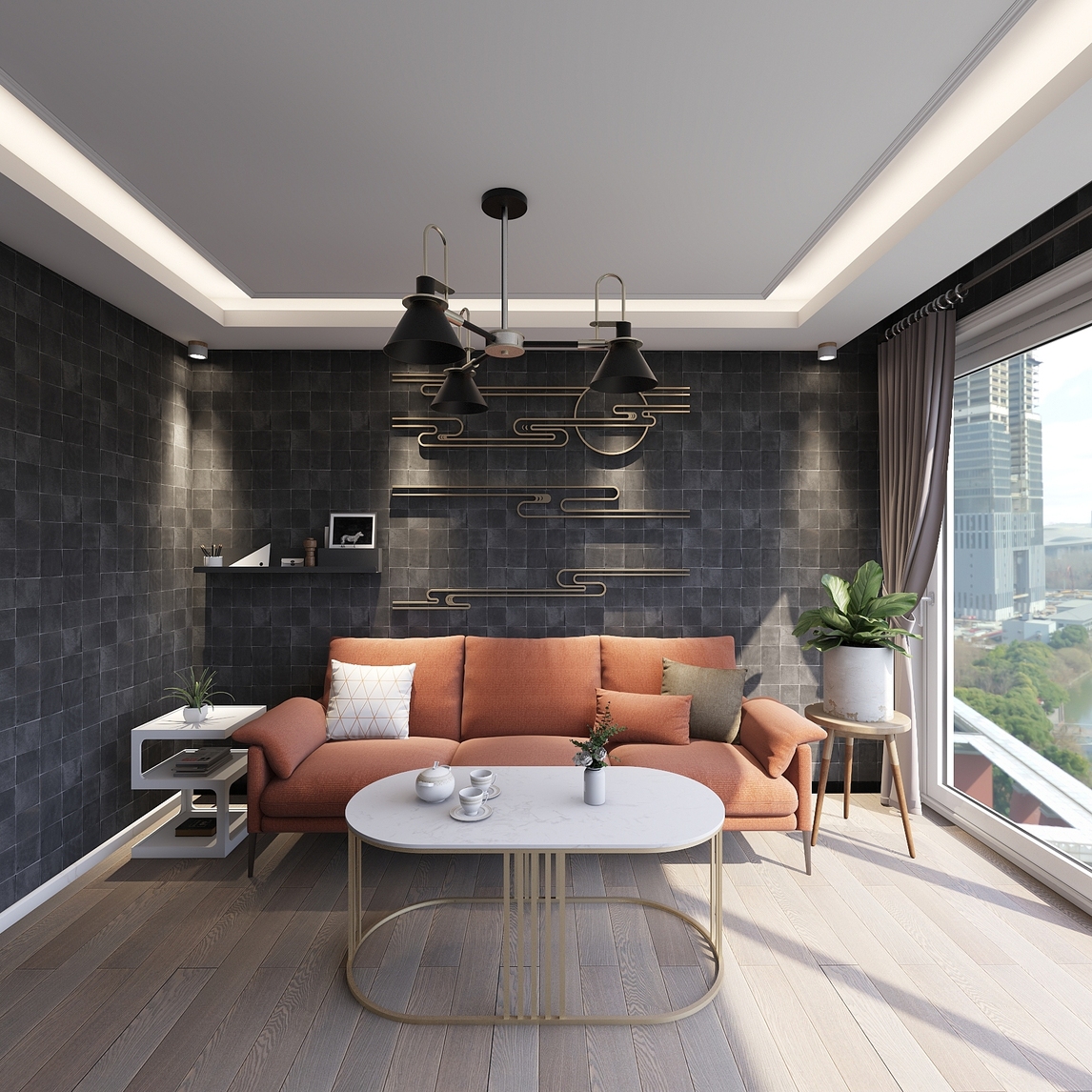 深灰色的墙壁让人感到沉稳的同时也让人感受到压抑,而格子设计打破了这种压抑感,让休息厅更具现代艺术感,搭配上祥云图案的金色装饰壁挂,更是凸显出屋主的时尚品位。 橘色的布面沙发更是让空间有了几丝俏皮的味道...展开