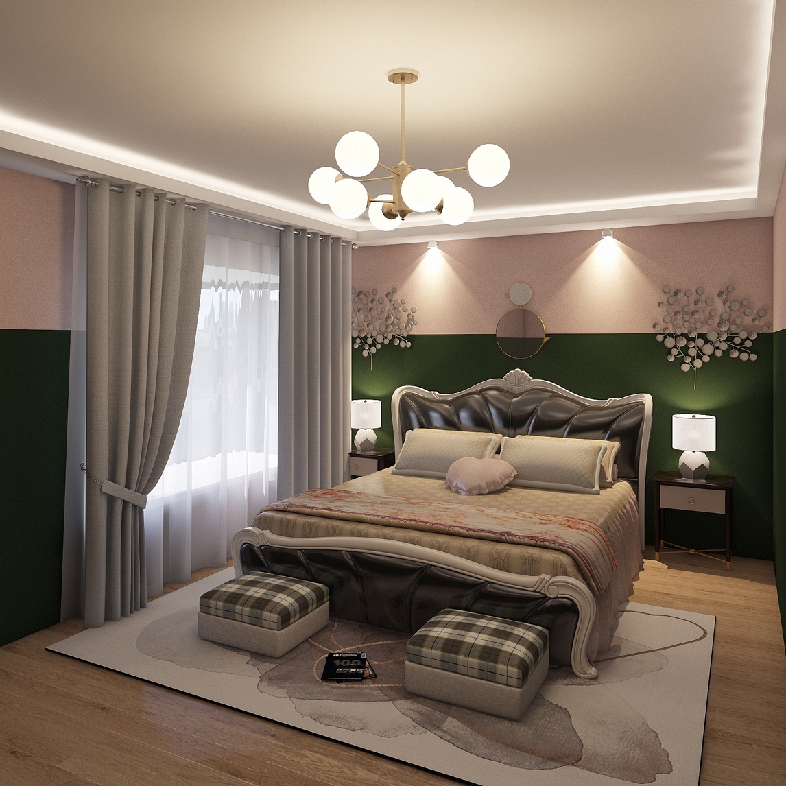 卧室大胆采用了粉红和墨绿的撞色墙面,让空间看起来更有层次感,在时尚度方面也加分不少,打造出强势的吸睛效果。搭配上经典欧式大床,床头的皮质软包和实木床架相搭,打造出高端的品质感。床脚还以脚凳+地毯打造出...展开