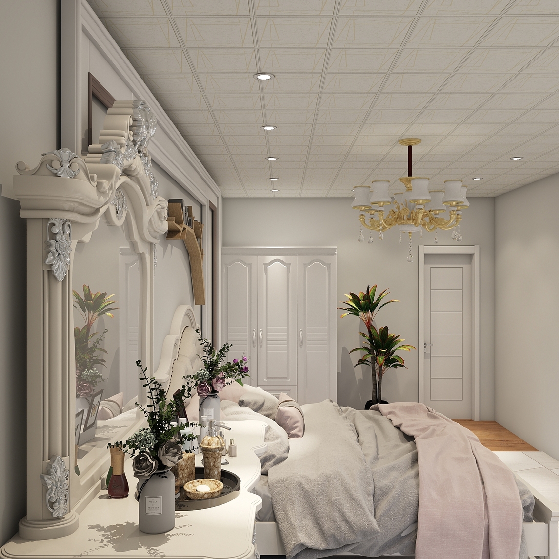 卧室窗户光线和通风都特别好。床头设计了背景墙,这个设计是年轻人比较喜欢的。卧室面积够大,所以梳妆台是必须要有的,足够收纳的衣柜,旁边点缀绿植,美轮美奂的卧房让人想要一直待在家里。