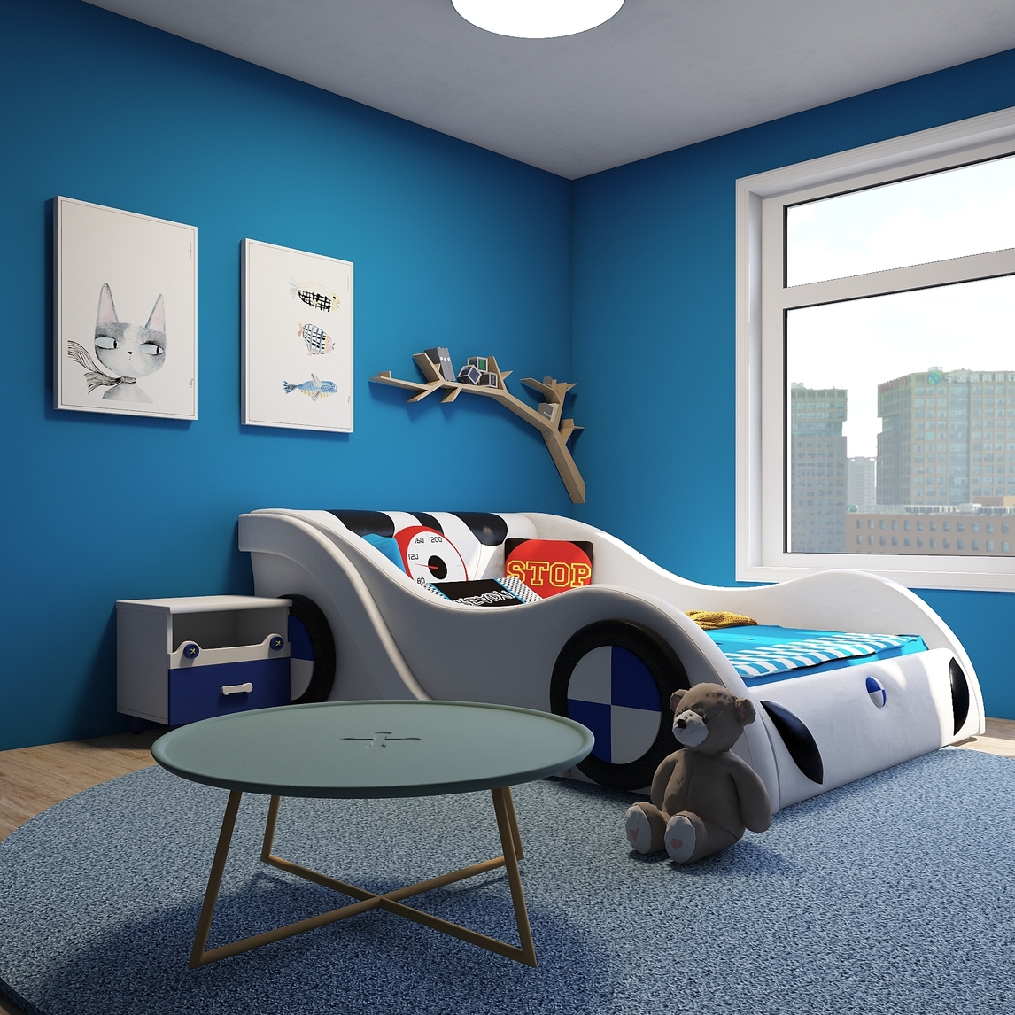 极具现代感的儿童房设计,舍弃了许多不必要的装饰,让整个空间看起来更加整洁明亮。蓝色的墙面搭配灰蓝色地毯,柔和舒缓的色彩有助于安抚小男孩躁动的心,让他更好的进入梦乡。此外还在床具的选择上加入了小男孩最喜...展开