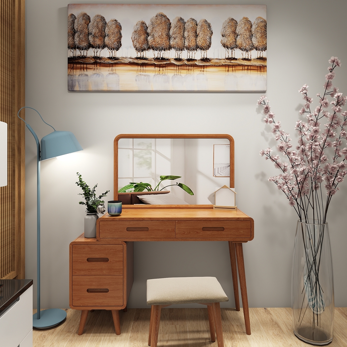 梳妆台的颜值和国画的美相互衬托,优美的落地灯给您光线的补充和颜值的补充。大大方方的镜子照亮你的美,优美的樱花点缀着您的美