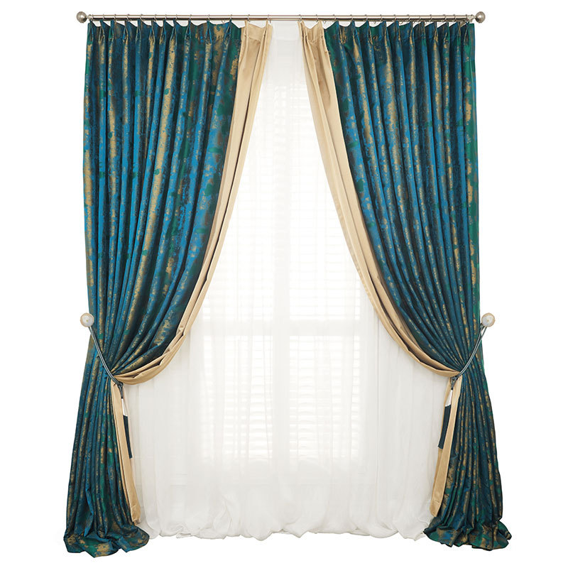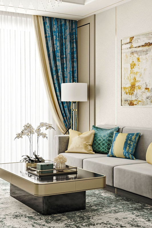 设计师说: 看惯了黑白灰的搭配,我们来点不一样的家居色彩美学搭配方案。蓝绿色搭配灰金色,华贵耐看,将抽象的孔雀石花纹融入到窗帘、装饰画、地面铺设,配上线条明朗的沙发、墙面,整体空间散而有序,华丽优雅。