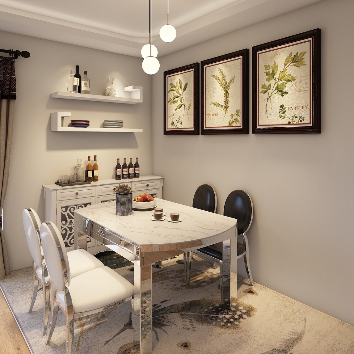 欧式的餐桌和欧式的酒柜,让你吃饭的硬件都是欧式感,满满的皇家气息,配上中国的国画和中式的地毯,让房间充满中国的韵律美