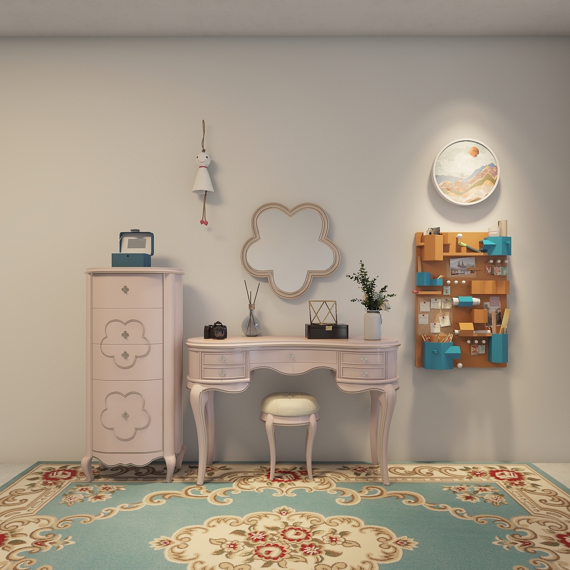粉色的梳妆台搭配花型的梳妆镜子,灯光昏黄,使得心情舒畅,旁边加上一个杂物袋子,可以装一些小饰品。蓝色的地毯更好的太亮整个空间的亮度。