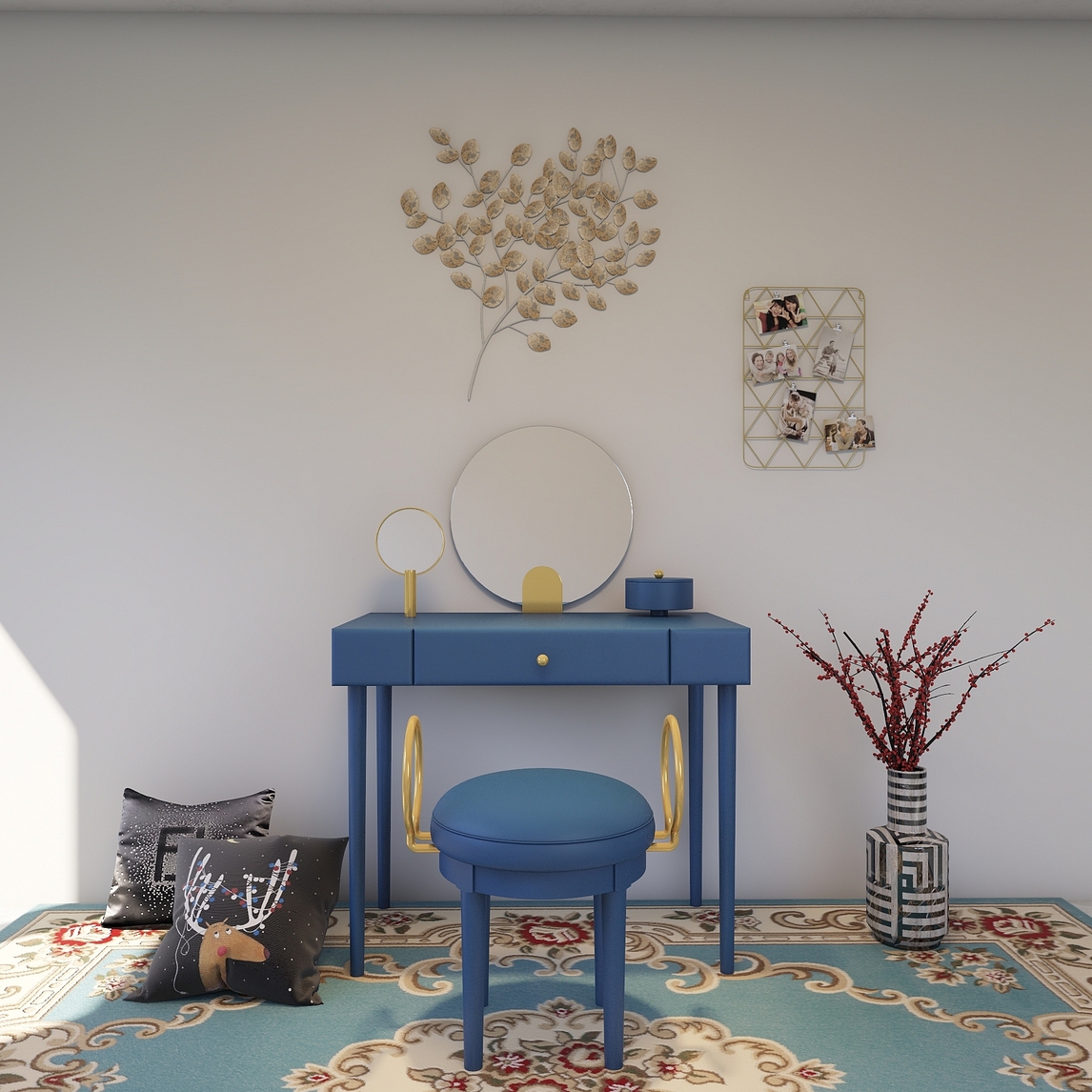 深蓝色复古颜色的梳妆台,搭配白色墙面,凸显出梳妆台复古七夕,配合复古欧式蓝色地毯,不张扬,不沉闷。色彩对比强烈。