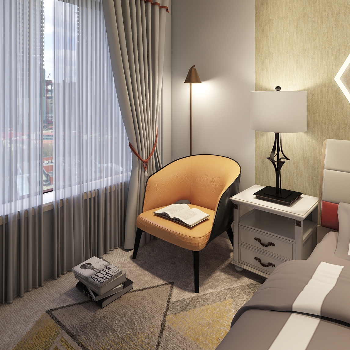 橙色的座椅给你年轻和活力的感觉,坐在这里,后面的落地灯给你光线的补充,漂亮的台灯给你视觉的美感,踩在地毯上,感受着一刻吧