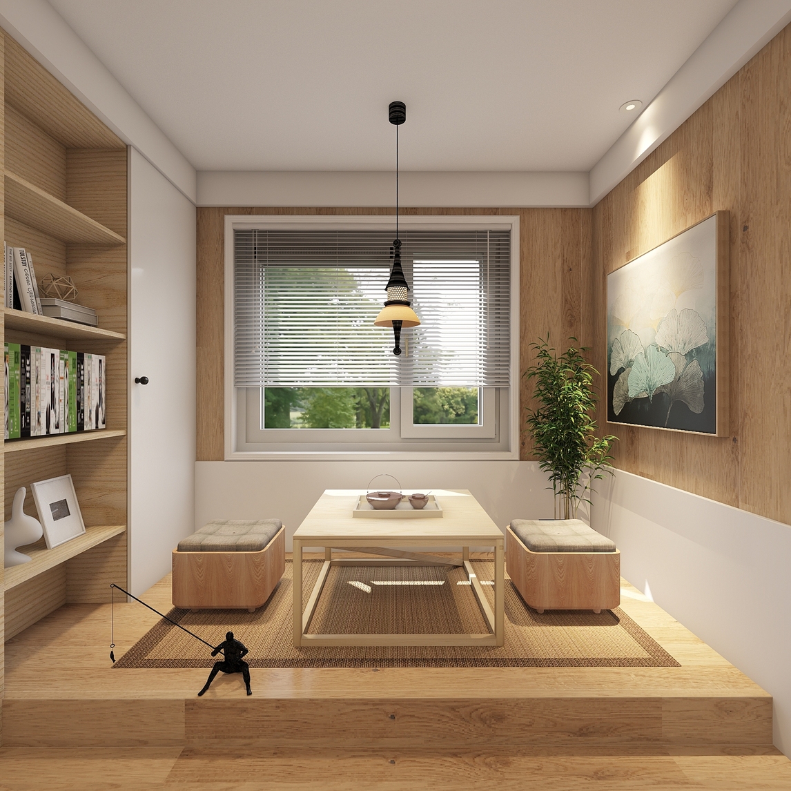 阳台如果有足够宽敞的空间。可以设置一个榻榻米,木质的设计让人凝神养心,垫子是藤编的让空间更有自然的味道,两人两杯一盏茶,一起体验生活的美妙。