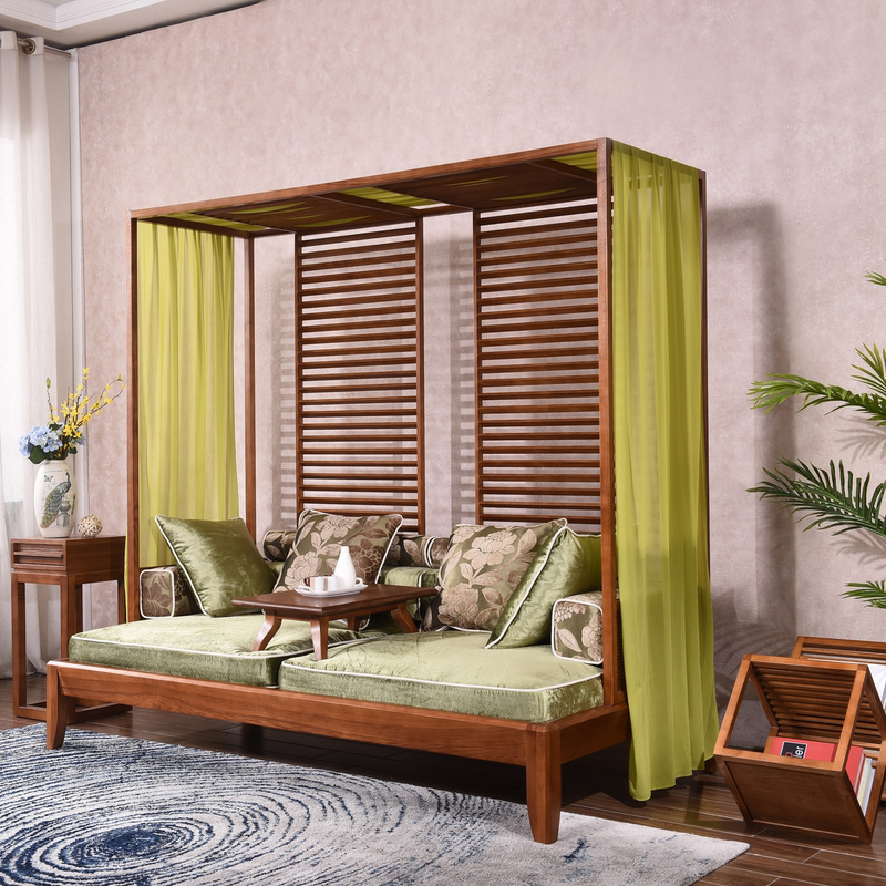 现代都市快节奏的生活方式,我一直在寻求一个闲适惬意的家居空间。客厅里用罗汉床代替普通的沙发,既可以躺卧可以的斜椅,两侧的幔帐达到的了“刚柔结合”的目的。 墙面要比家具的颜色浅,空间显得有层次感。