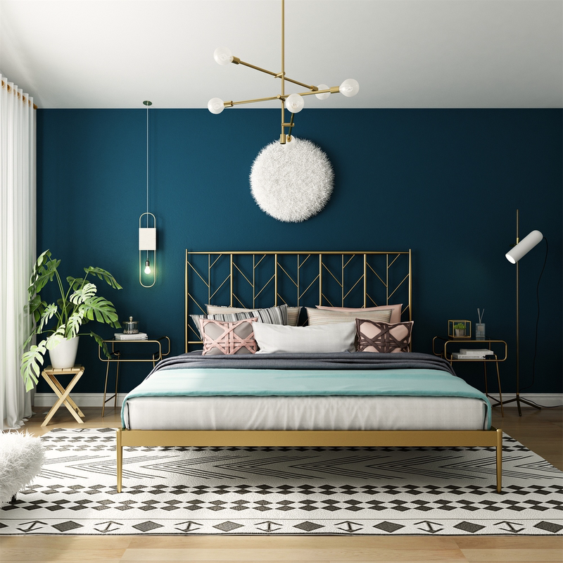 卧室设计以轻奢ins风为主,背景墙是个亮点。家具选择上,香槟金铁艺床,颜色超正,格调感满分!搭配同系列的铁艺床头柜,更具有统一性~