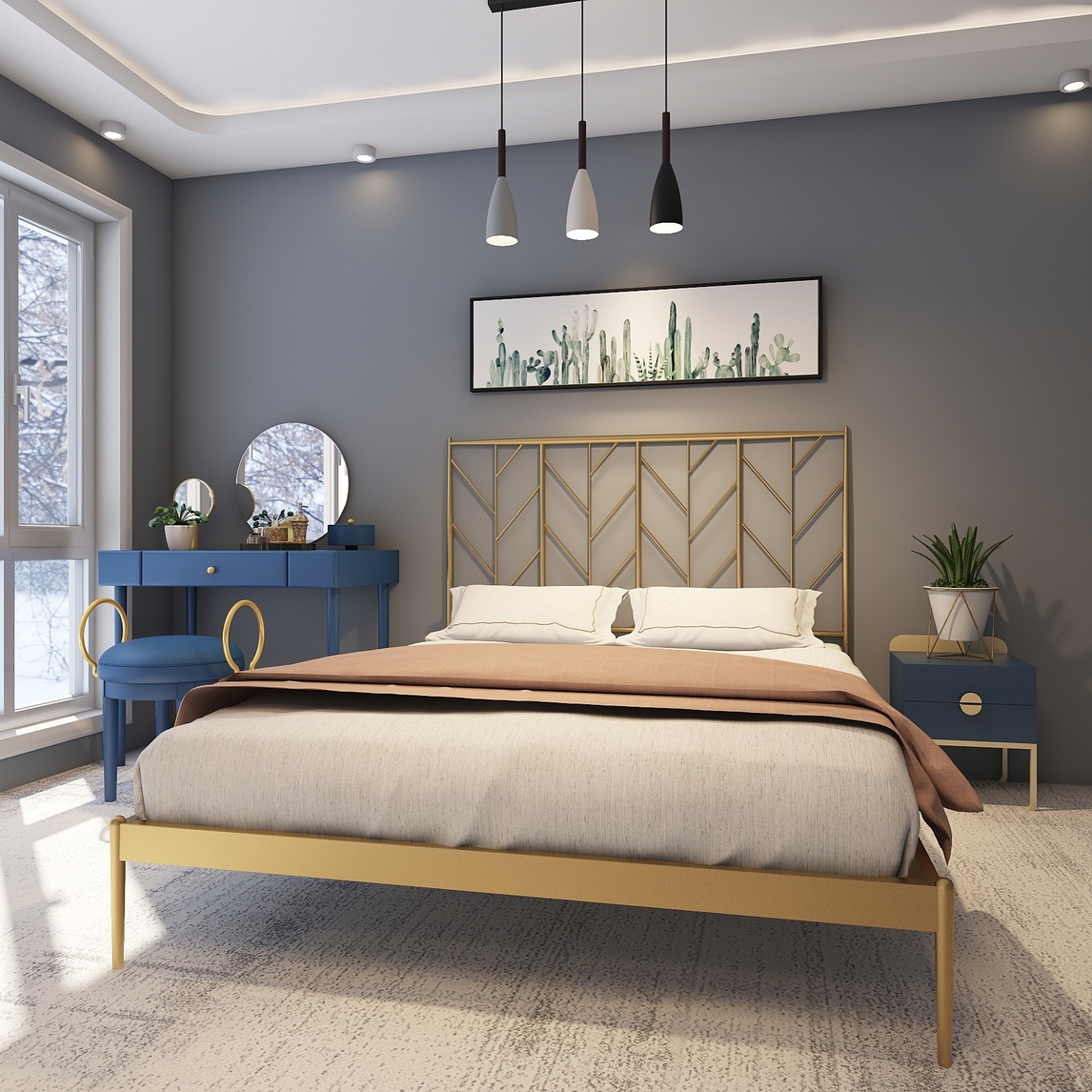 充满质感的灰色墙面搭配斑驳的灰白色地毯,营造出极具现代感的时髦空间。然后用高脚设计的家具作为搭配,金色双人床和海蓝色梳妆台以及床头柜作为组合,家具轻盈的造型和时尚用色让整个空间充满了柔美优雅的轻奢感,...展开