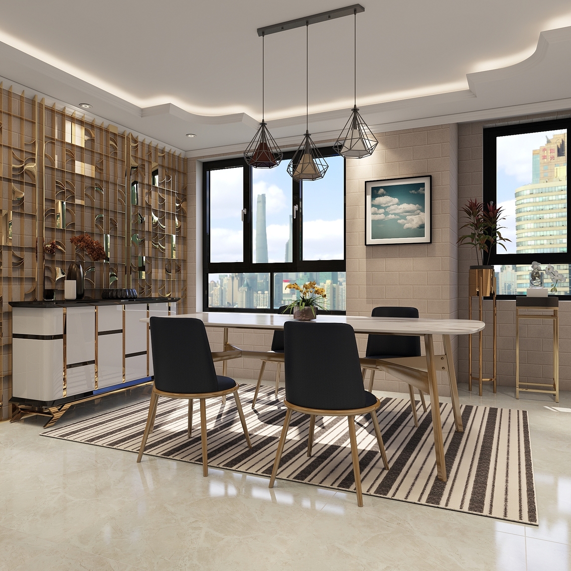 餐厅以柔和的米色为基调,用金色镂空背景墙+黑白色餐边柜烘托出空间的精致轻奢调。然后加入大理石餐桌和黑色高脚餐椅作为搭配,高脚设计和金属元素相撞,让空间看起来更加轻盈同时也显出优雅的高级感,让你在家就能...展开