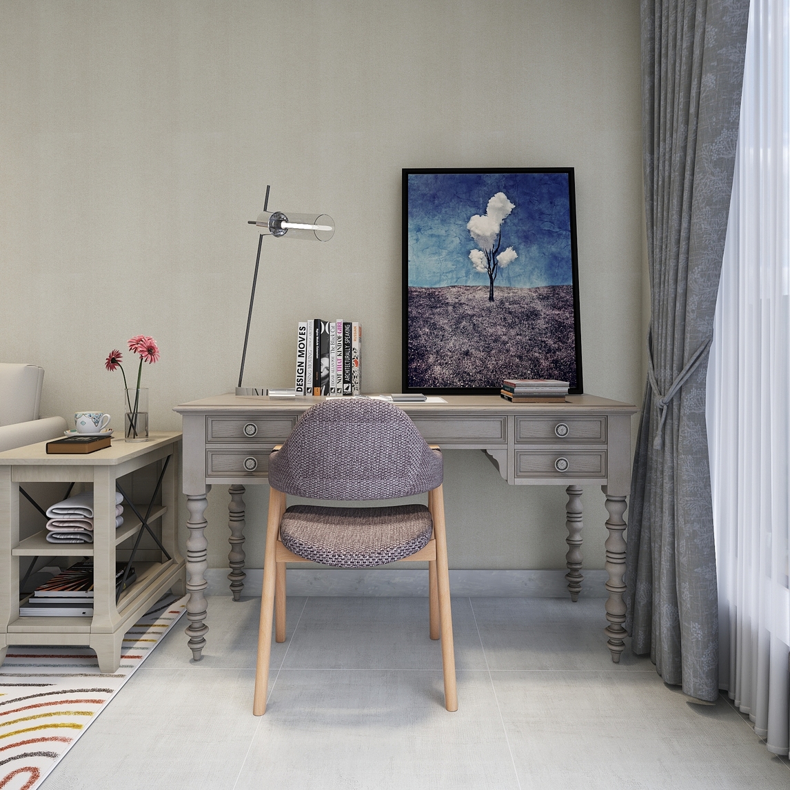 客厅旁的阳台上,打造精致的小书房。复古的书桌,像是一个有故事的朋友,在你工作写作的时候,和你一起寻找,那些曾经的灵感。时尚简约的台灯,增加了这个小空间的气质,别让你更容易投入工作之中。
