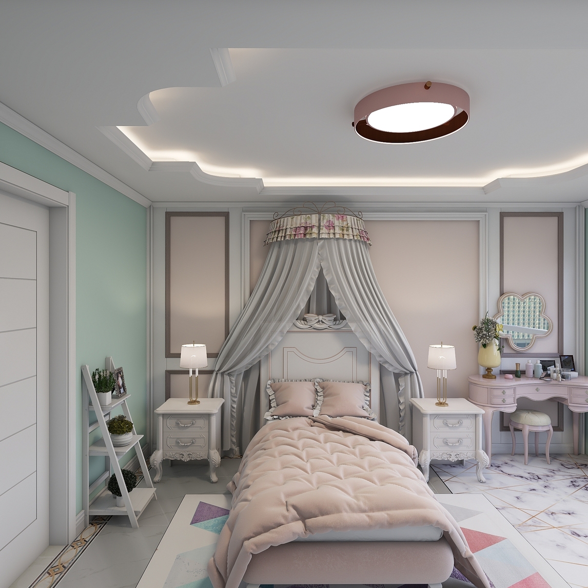主打马卡龙色调,床、纱幔、床品,满满的都是少女心,整个空间色彩分明,却丝毫不显杂乱。粉嫩嫩的卧房,连空气似乎都是甜的。