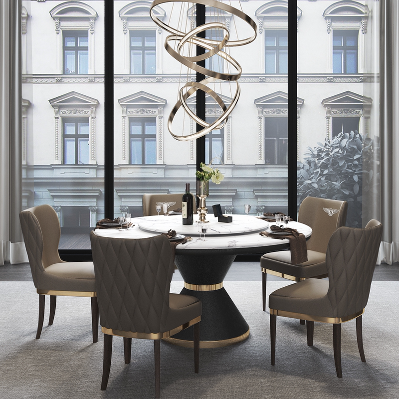 明亮通透的落地玻璃,阳光射入暖光的室内,带点意式味道的简约轻奢大理石餐桌,不得不说充盈了高B格的餐椅有点儿奢华!杏色撞上黑色,浅灰调映衬,意味浓浓的轻奢餐室油然而生!