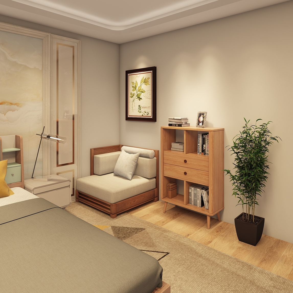 实木沙发给你高度的柔软和舒适感,好看温馨的书架,让你放下自己心爱的书本,开心的读书,再配上好看的国画,美极了