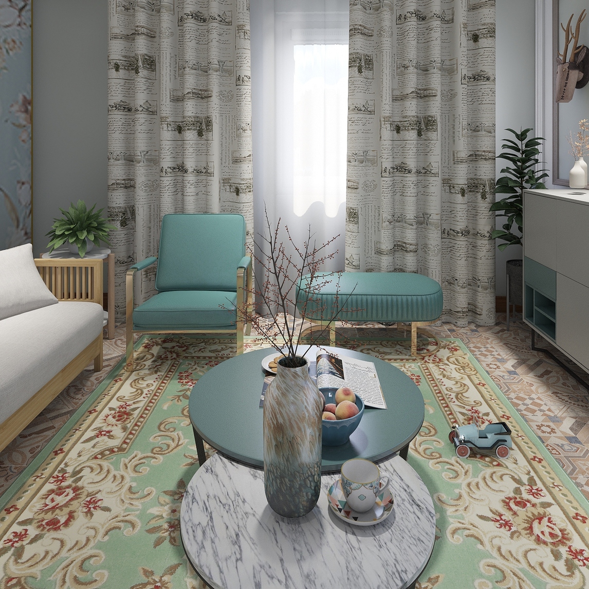 茶几和沙发凳都是几何线条和形状构造,与翠绿色完美碰撞,搭配美式田园风格的地毯与窗帘,混搭风的完美结合,让客厅显得更加温馨、浪漫。