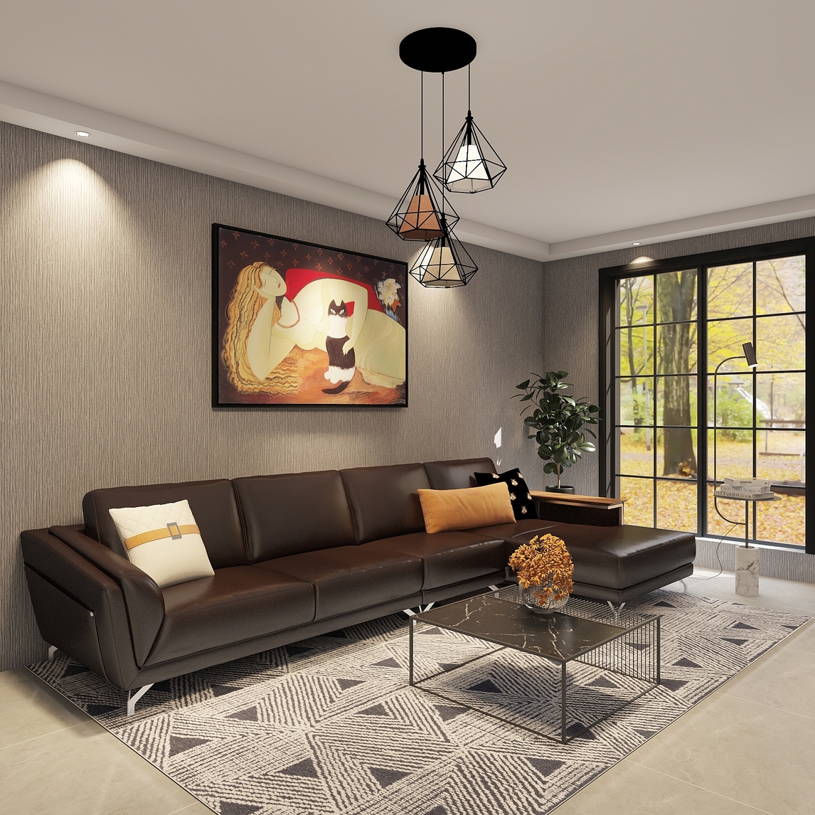 不同风格的家具杂糅在一起更有不一样的味道。棕色的皮质沙发极具现代感,利落的线条、简约的设计给空间带来了时尚品质的视觉感受,而茶几与砖石状的吊灯,都采用了铁艺打造,保留了粗犷的面貌,同时金属材质更具冷感...展开