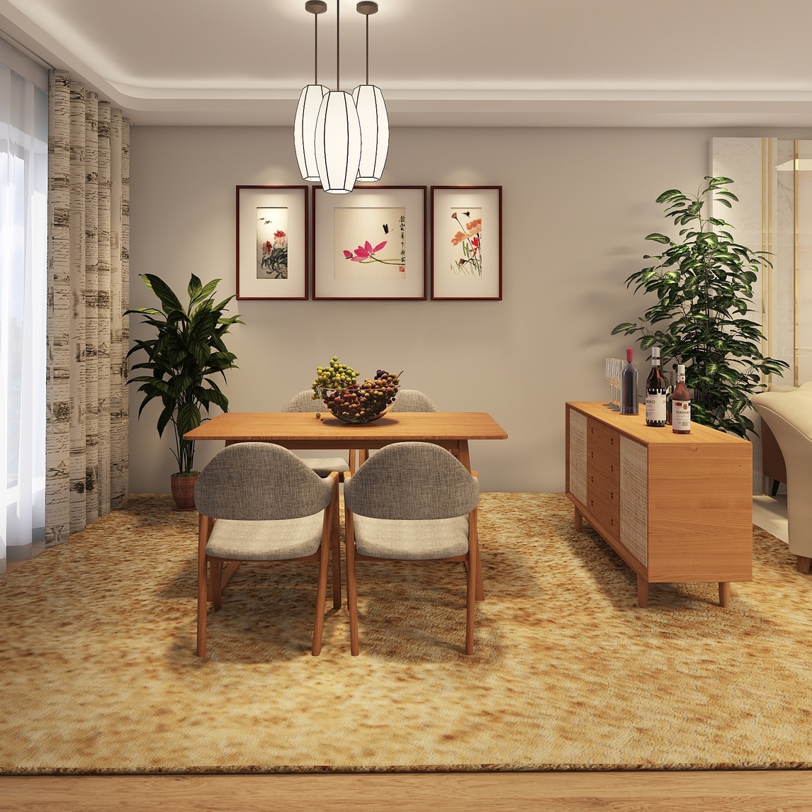 暖色的实木色总会给人一种温馨和自然的感觉,搭配上绿植,让餐厅渲染出一副生机盎然的美感,搭配上自然的国画,漂亮极了