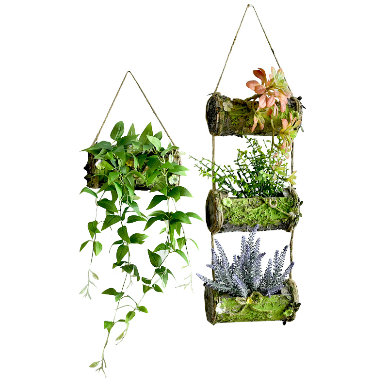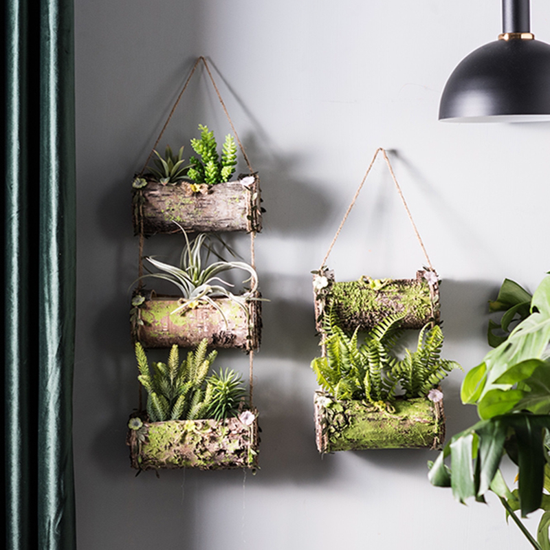 客厅墙面吊挂了两个树皮花盆,质朴自然的树皮纹理用来养植多肉和绿植,效果非常的棒,轻松就能营造出浓浓的田园风。