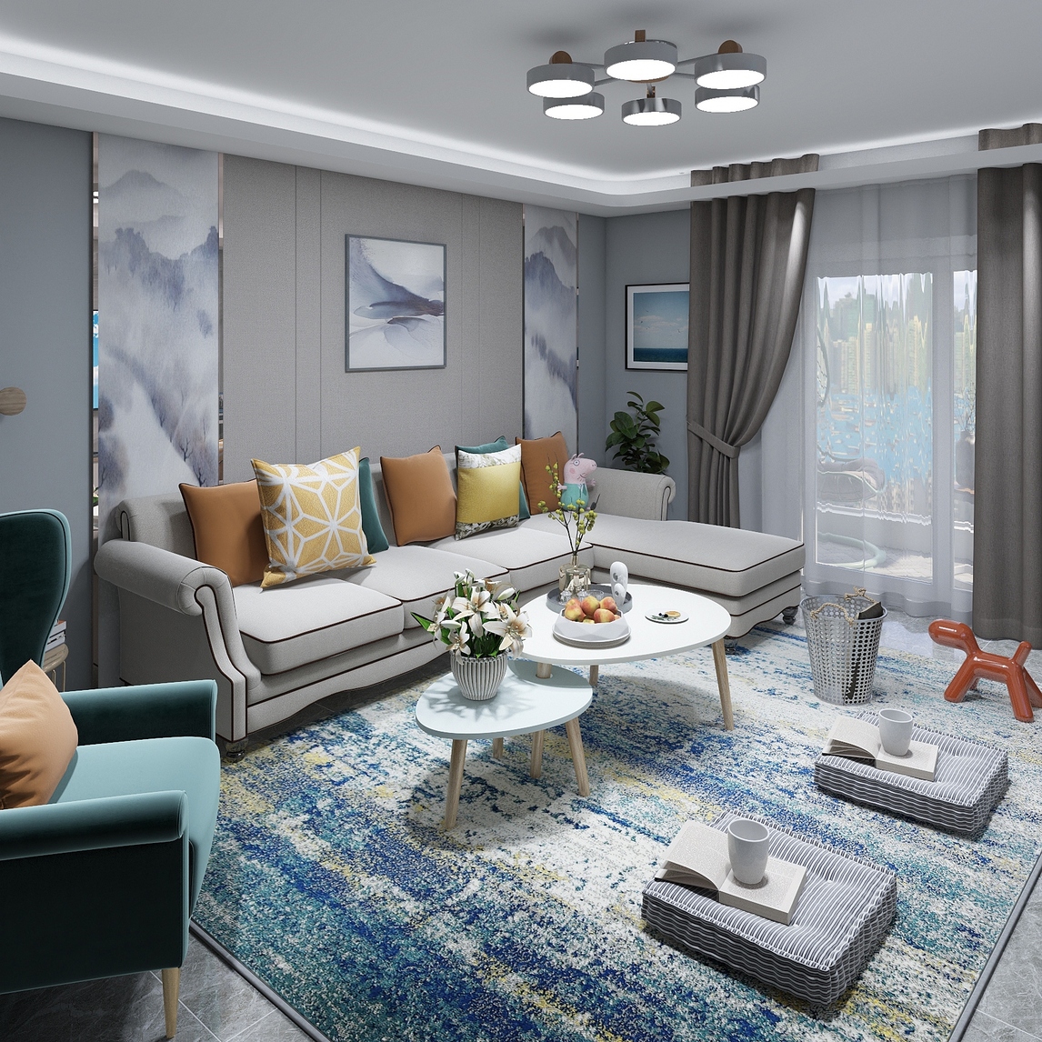 纯色布艺沙发,米黄色格调抱枕,天蓝色手工地毯,北欧风格与现代风格的融合,纯色设计,简单大方极具动态美感。