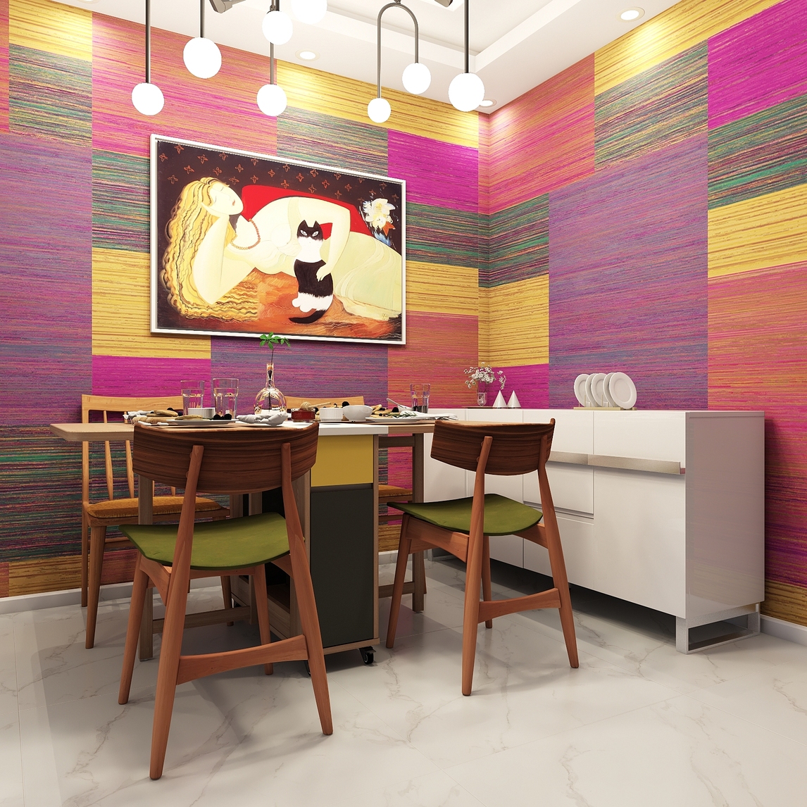 色调鲜明的餐厅墙壁,多色彩的空间设计,使得餐厅充满了活力感,有如童话一般,再搭配上艺术挂画,更显其中的个性与趣味,十分适合追求自由与时尚的年轻人。 木质的高脚桌椅设计,能带给人一个更为舒适的感受,让在...展开