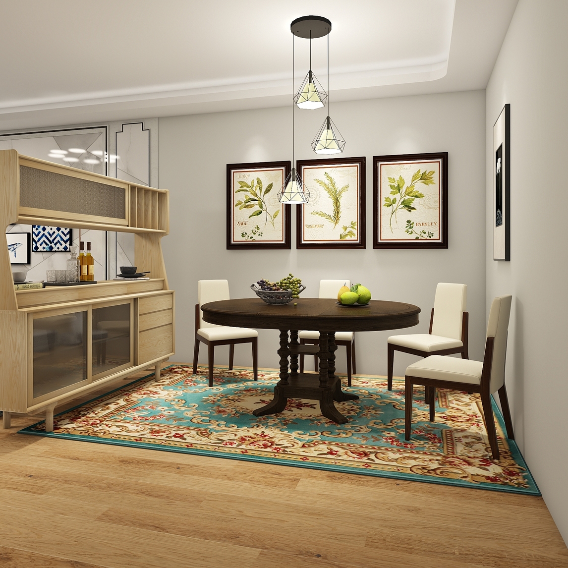 漂亮美丽的国画搭配上美式风格的餐桌,轻盈自然的感觉加上美式厚重感,两者相辅相成,再搭上好看的欧式地毯,小的圆明园