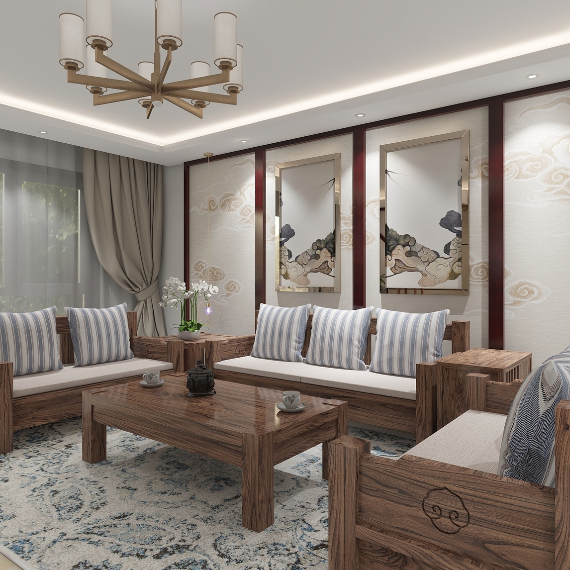 新中式装修设计讲究布局对称均衡,端正稳健,追求创意中式生活,此方案中背景墙上的传统祥云图案与家具上的如意纹饰,不仅意境和谐,寓意更是美好。