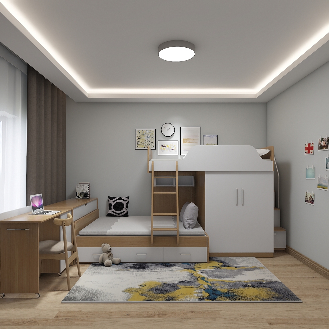本案针对当下二胎家庭设计的儿童房,采用上下床的形式,在满足休息的情况,同时考虑到儿童的储藏,就把衣柜和榻榻米的形式,把上下床连接起来。考虑到儿童的学习,搭配转角书桌最大利用空间,再搭配一个北欧风的地毯...展开