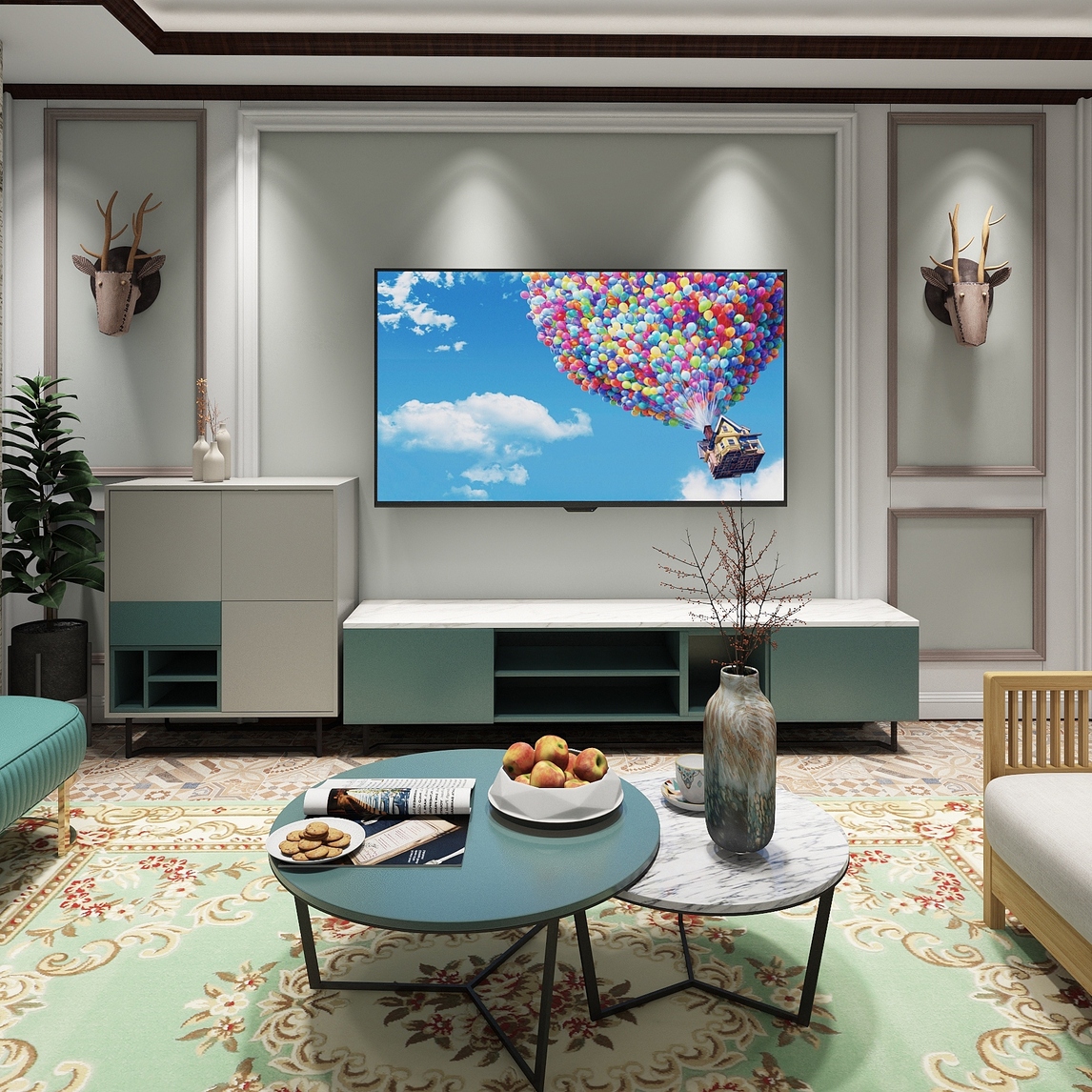 整体以北欧风格为主,几何形金属茶几、电视柜,创意地毯等等,融入美式田园风格电视背景墙与牛头壁饰及摆件,在简单大气的同时又不是失精美,温馨的同时又增添些复古雅致。