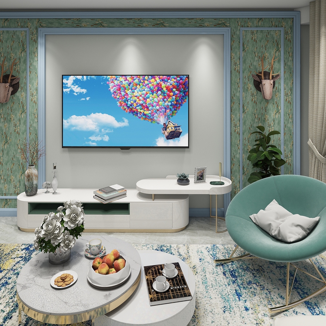 北欧简约风与美式田园风完美结合,茶几、电视柜、背景墙、地毯、沙发融入各种不一样的绿色。绿色代表意义为清新、希望、平静、青春、放松等等。非常适合小户型客厅,温馨、美观大气、时尚典雅。